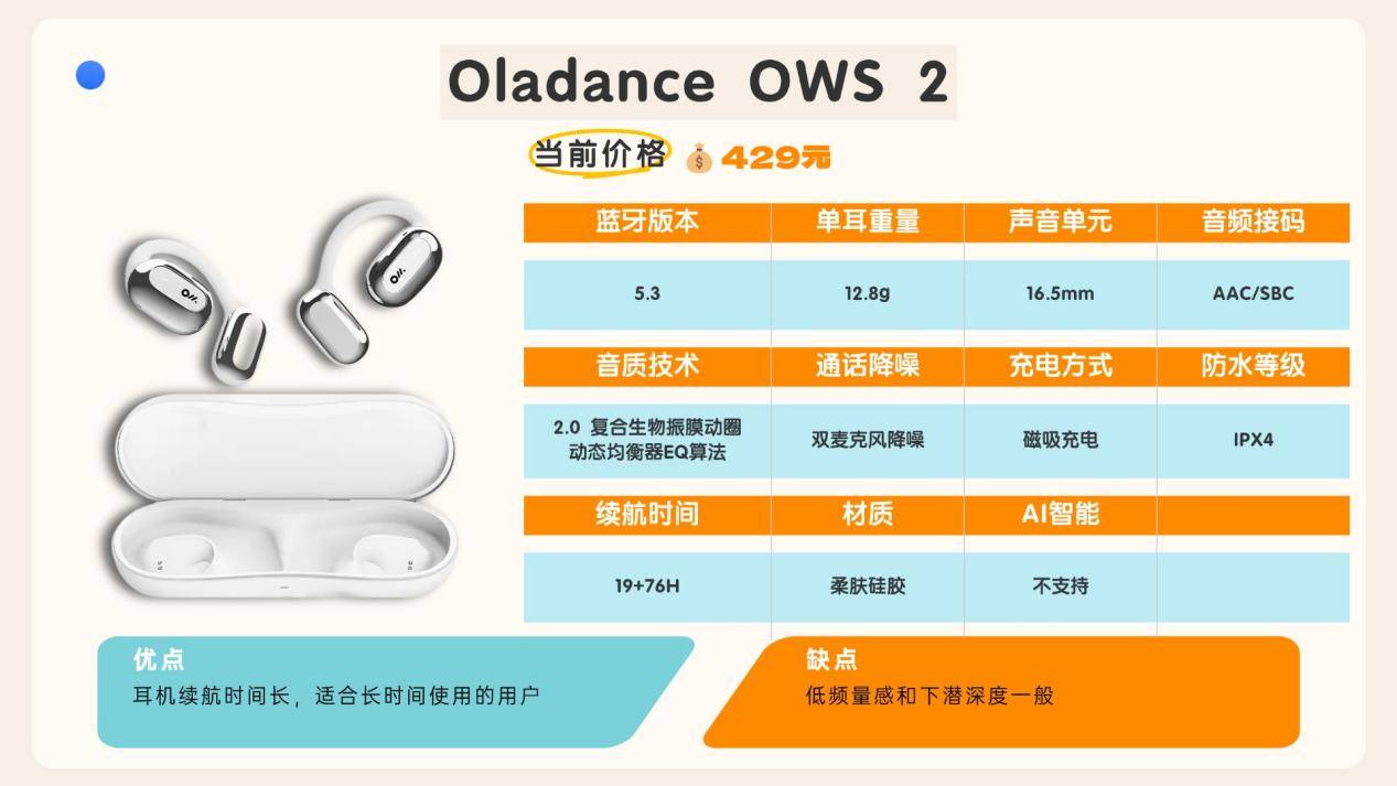 功能配置上,Oladance OWS2支持蓝牙5.3版本,连接更为稳定,延迟进一步降低,抗干扰能力也有明显提升。续航能力方面,单次满电使用最长可达19小时,搭配充电仓后的总续航时长能达到95小时;只需快充15分钟,就能提供约350分钟的使用时间。此外,该耳机支持双设备同时连接,且兼容安卓与苹果系统,为有多设备使用需求的用户带来了更高的便利性。
