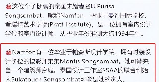 Namfon在泰国属于中产阶级,虽然比不上霍家条件,但是本身都很优秀,在泰国的顶级学校毕业,后来到美国的普瑞特艺术学院学室内设计专业。
