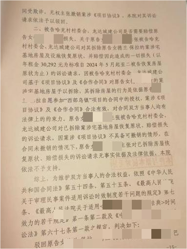村民一方不服一审判决提起上诉,新疆克拉玛依市中级人民法院于 2025 年 7 月 28 日公开审理此案并作出终审判决。二审法院认定,案涉《项目协议》是双方真实意思表示,内容合法,村委会已履行征求意见等程序,村民签约时应知晓房屋可能被整体拆除的后果,不存在欺诈情形;自 2021 年项目施工起,权利人即应知晓房屋将被拆除,直至 2024 年才提起诉讼,已超过合同撤销权一年的除斥期间,撤销权消灭;加之项目涉及整村改造,房屋恢复原状已无可能,故驳回上诉,维持原判。