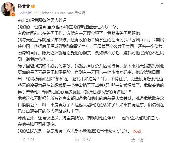 9月13日,孙菲菲突然在社交平台上发布离婚声明,“没有必要假装婚姻美满的样子,现在很好,谢谢朋友们一直以来的关注,毫无束缚,做回自己,虽不完美,但很完整!” 简单的几句话,宣告了她与美籍华人前夫史宏十年婚姻的终结。本以为这只是一段婚姻的正常结束,然而后续孙菲菲的一系列发文,却揭开了这段婚姻不为人知的伤疤。