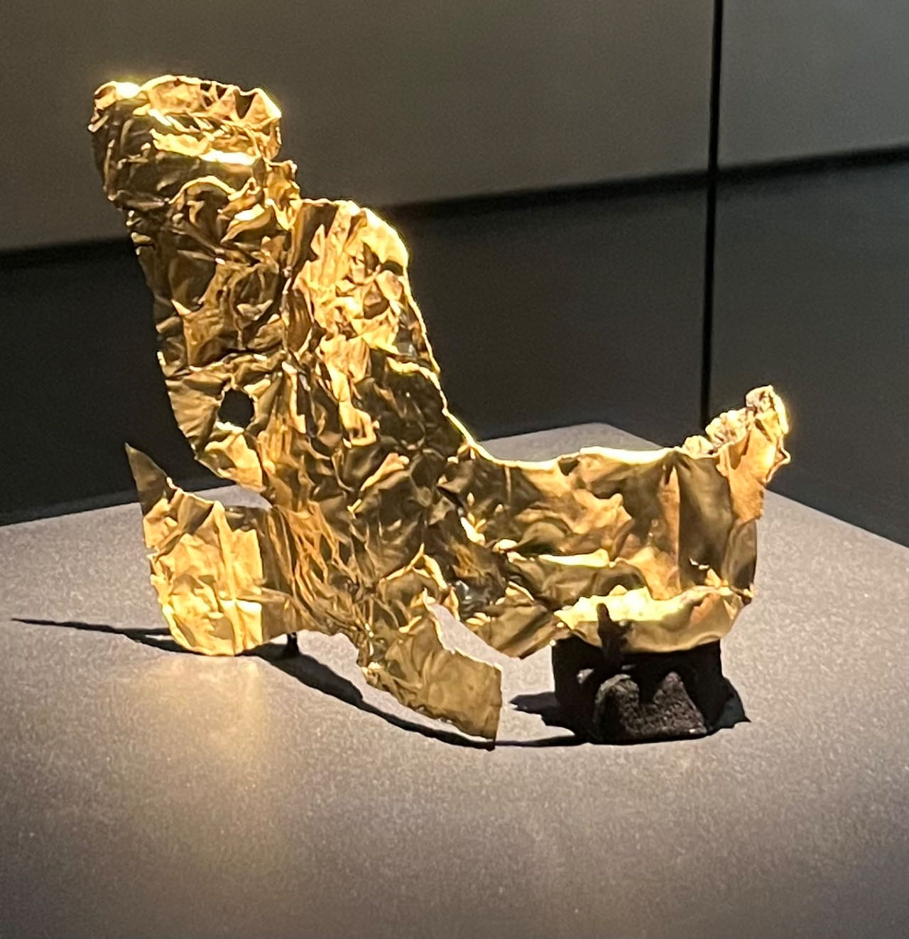这半张金面具出土于5号坑,宽度约23厘米,高度约28厘米,比完整的金沙大金面具还要大,含金量大约为84%,虽然只有半张,但金光灿灿、耀眼夺目,令现场的考古专家大为震撼。金面具具体是作何使用,目前还没有准确结论,需进一步考古挖掘和研究考证。