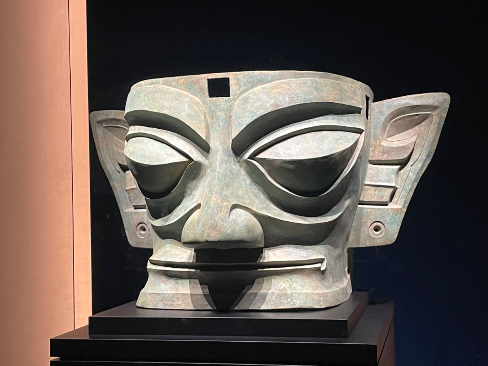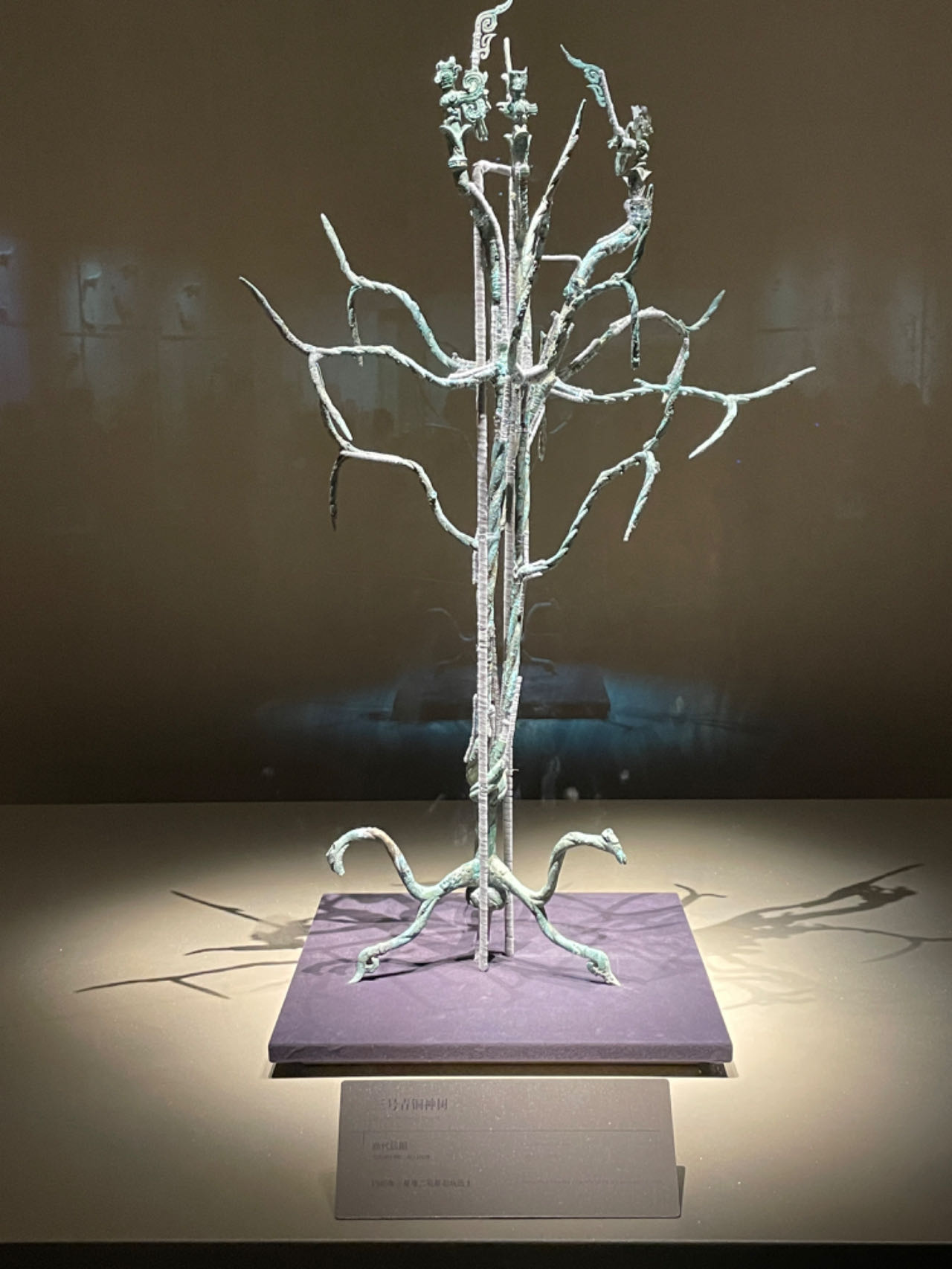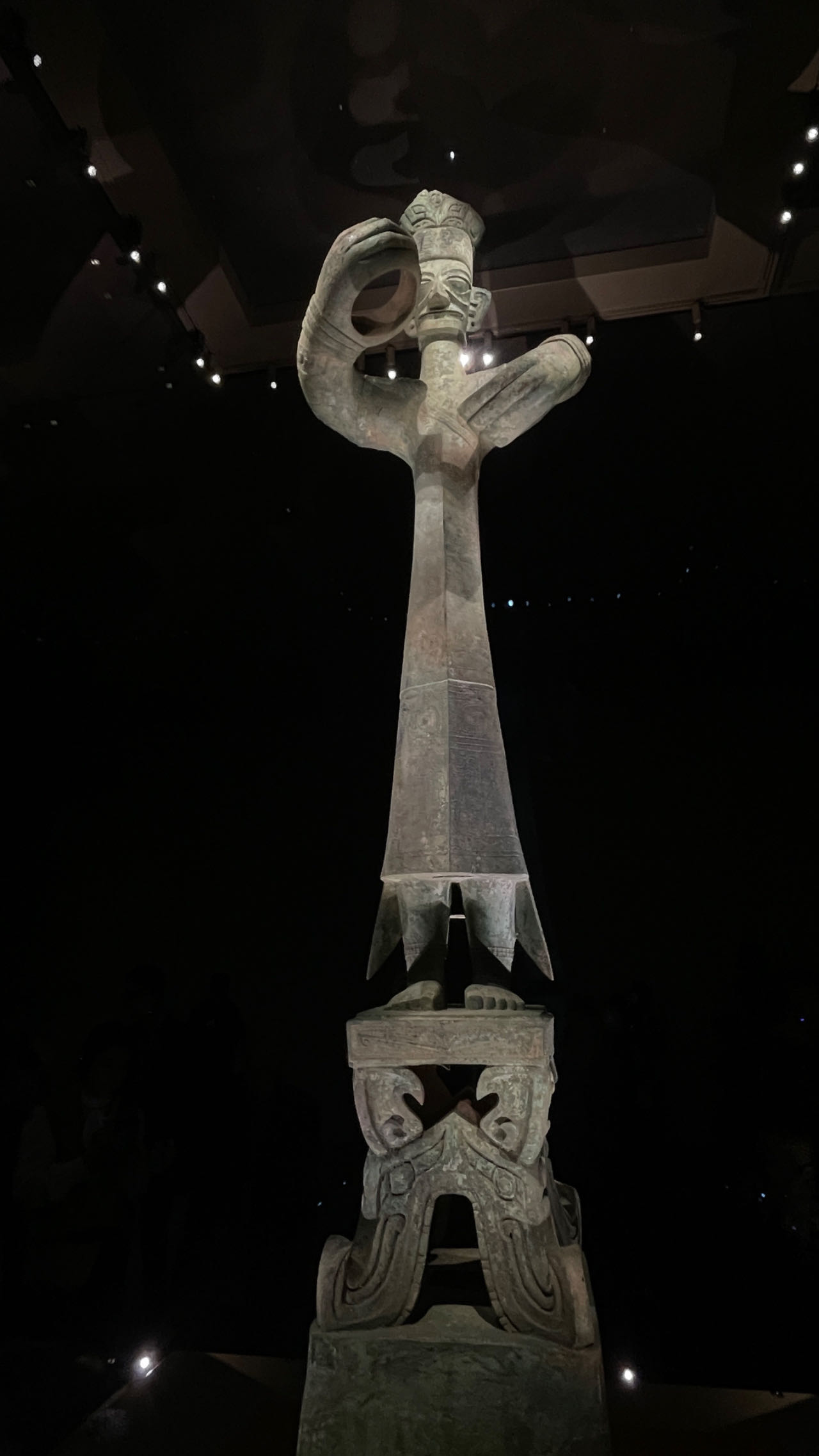 高2.62米的青铜大立人、宽1.38米的青铜面具、高3.95米的青铜神树等均堪称为独一无二的旷世神品。