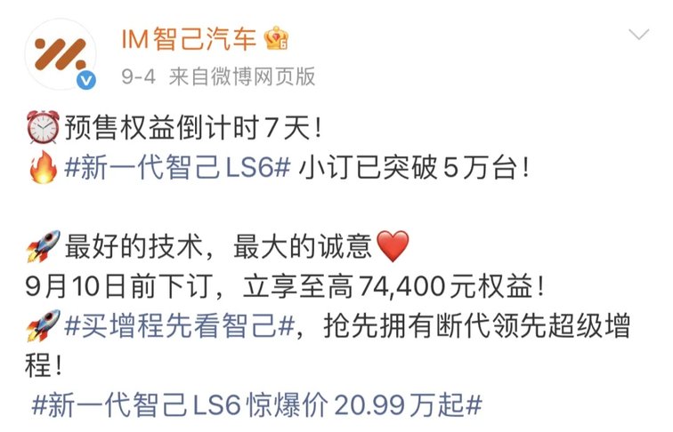 为扭转销量颓势,智己选择跟风布局增程技术,并将其作为突破口,于 9 月 10 日正式推出全新智己 LS6。新车共提供 9 个配置版本,上市权益价区间为 19.79 万 - 26.99 万元,试图通过 “增程 + 高配置” 的组合吸引消费者。从官方披露的信息来看,全新智己 LS6 的核心亮点集中在两大维度: