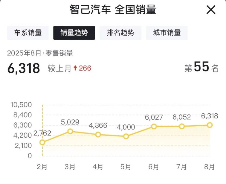 作为上汽集团布局新能源高端市场的核心品牌,智己汽车自诞生起便肩负着开拓市场的重要使命,但其市场表现却未能匹配这份期待。2025 年以来,智己旗下 4 款在售车型月销量始终未能突破万辆,即便是全年表现最好的 8 月,总销量也仅为 6318 辆,整体业绩处于低迷区间。