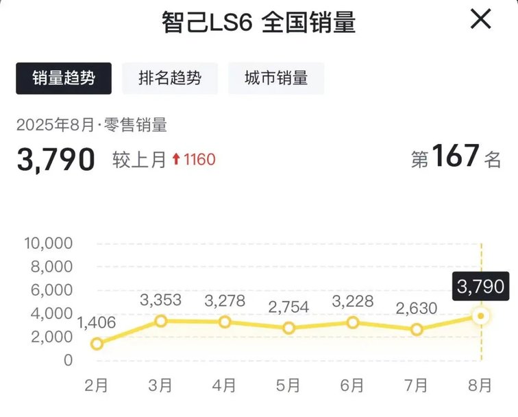 而作为品牌 “销量担当” 的智己 LS6,表现同样不尽如人意。2025 年以来,这款主力车型的月销量长期徘徊在 3000 辆左右 —— 对于一款承载着品牌销量突围期望的核心产品而言,这样的成绩显然未能达到市场预期,也凸显出智己急需打破销量僵局的紧迫性。