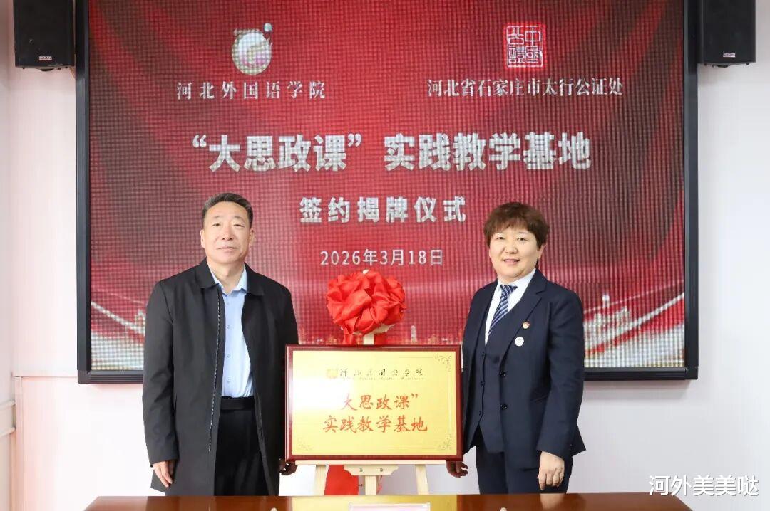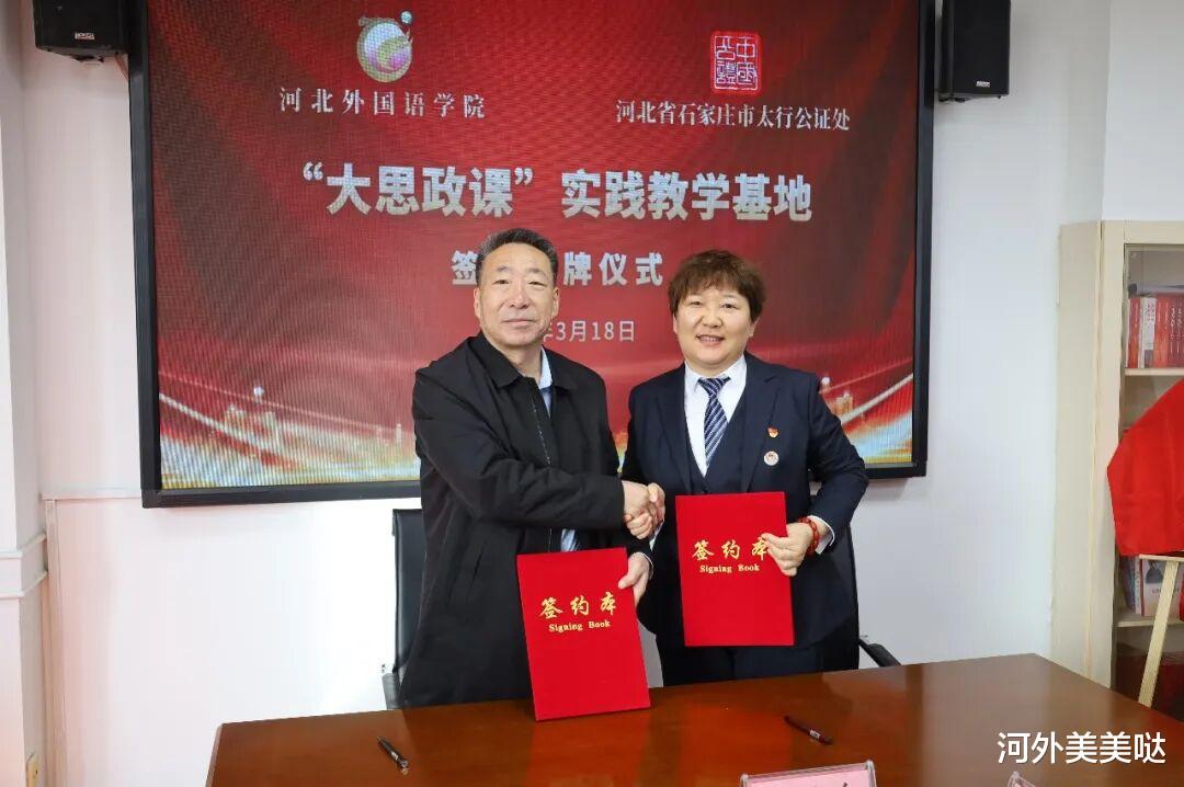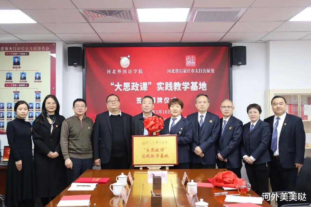 为深入贯彻落实习近平新时代中国特色社会主义思想,以及习近平总书记关于爱国主义教育、法治教育的重要指示批示精神,3月18日,河北外国语学院与石家庄市太行公证处举行“大思政课”实践教学共建协议签订仪式,正式授牌太行公证处为“大思政课”实践教学基地,推动思政教育与法治实践深度融合,为提升大学生法治素养和社会责任意识搭建实践平台。