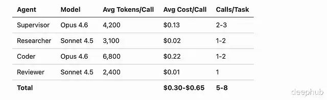 核心优化点是只对真正需要强推理的角色(supervisor、代码智能体)使用高端模型,任务范围更窄的智能体(研究智能体、审查智能体)换用成本更低的模型。仅此一项,成本下降了 40%。