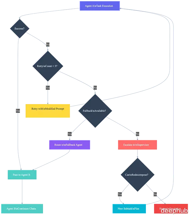 第一层是智能体级别的重试,用于处理短暂性故障,API 超时、速率限制、工具响应格式异常。在向上级报告失败之前,以指数退避策略最多重试三次。
