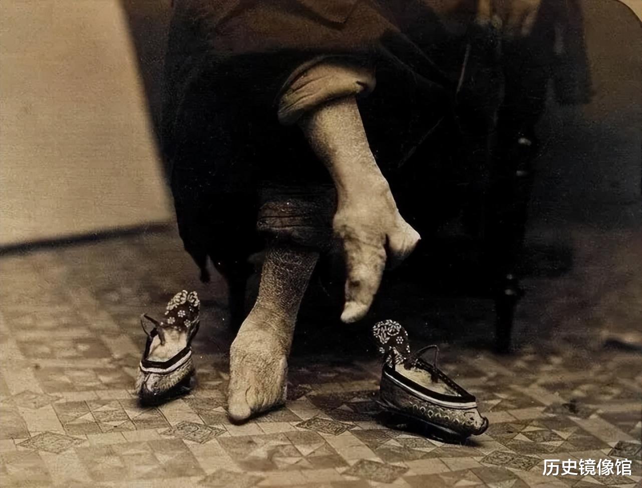 这些都是缠过小脚的女子。她们的脚就像尖尖的粽子,行走站立也会有点困难。