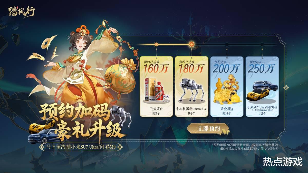作为一款超懂玩家想要什么的国风放置修仙手游,《踏风行》在玩家福利上也堪称“壕无人性”:预约即送海量公测福利,官网预约总人数每突破一个里程碑,就能陆续解锁飞天茅台、宇树机器人、黄金周边,小米SU7 Ultra/问界m9一年使用权等劲爆实物的抽奖。而且,5月16日公测首日登录即送100抽,首周狂送390抽!每日登录奖励也是各种珍稀道具不重样,极品器灵、绝品载具、绝品古宝、绝品时装应有尽有。