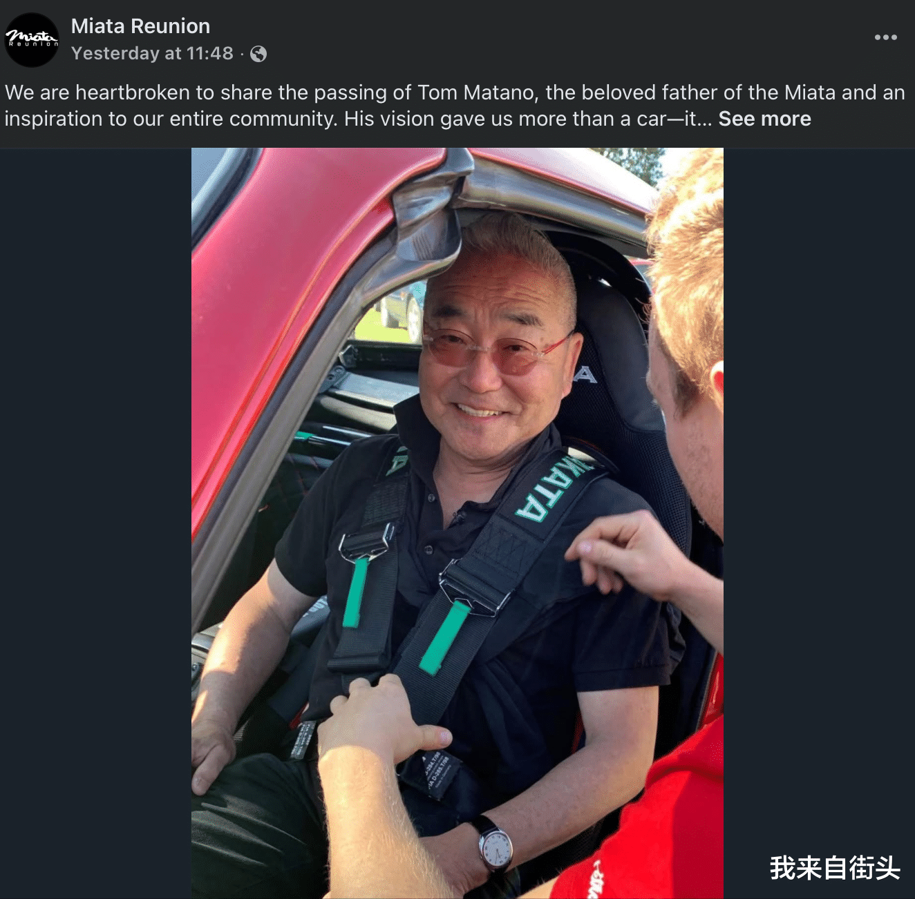 消息最早由车迷社群在网络上传出,随后Miata Reunion官方也确认了该消息。他一直以来都是世界Miata社群的忠实支持者,也经常现身活动现场与车主们以及车迷们互动交流,且还会亲手在许多辆Miata上签下自己的名字,并留下那句经典的座右铭:“Always Inspired”~