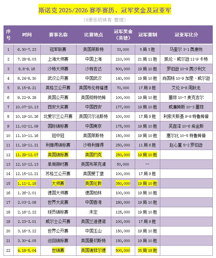 首轮(32强进16强):1万英镑第二轮(16强进8强):1.5万英镑1/4决赛(8强):2.5万英镑半决赛(4强):5万英镑亚军:10万英镑冠军:25万英镑斯诺克2025-2026赛季,从今年的冠军联赛开始,到明年4月举行的世锦赛,共有22站比赛。截至目前,已进行了11站(包括利雅得狂欢季锦标赛),冠军由11个不同的球员获得,如下: