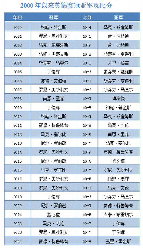 中国球员在英锦赛中,丁俊晖曾于2005、2009、2019三度问鼎,赵心童也曾于2021年夺冠。斯诺克英国锦标赛历史上,罗尼·奥沙利文以八次夺冠位居历史第一,史蒂夫·戴维斯六次夺冠位居第二,斯蒂芬·亨得利五次夺冠位居第三。