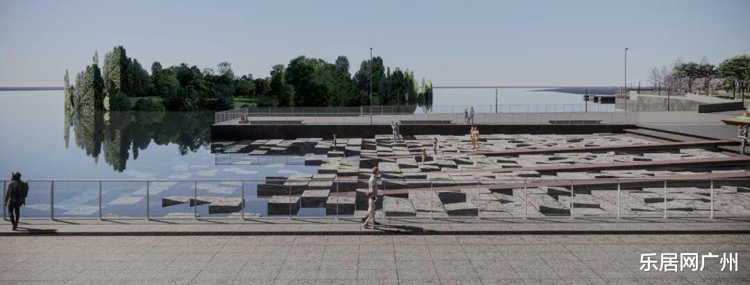 珠江新城的遗憾在于临江大道对水岸的割裂,而广州滨江天地通过“零线滨江开发”模式,给出了完美的解决方案:项目大胆地将建筑红线后退,平均退让宽度达250米。