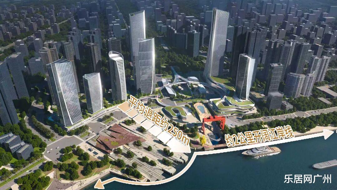 广州滨江天地平均退让江岸250米,珠江之间没有市政路相隔,突破珠江新城部分区域水岸隔离的局限,实现真正的“零距离亲江”。