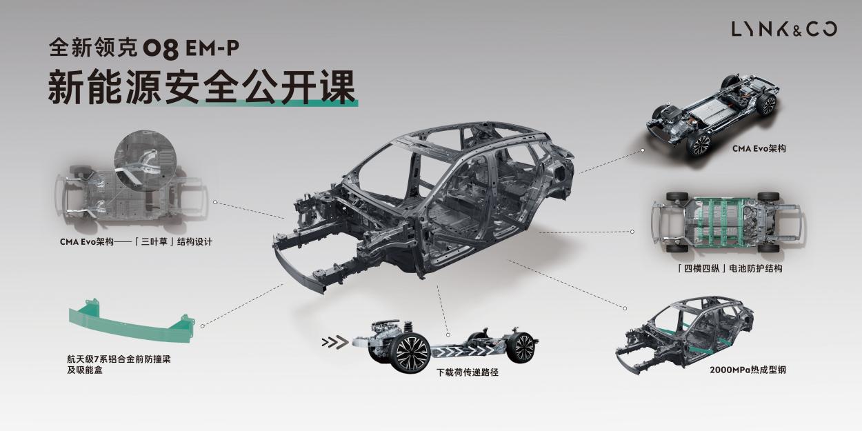 基于CMA Evo原生新能源架构打造的领克08 EM-P,在材料与结构设计上可谓“内外兼修”。其车身高强度钢与铝合金占比高达75%,关键区域使用2000MPa热成型钢与一体式硼钢门环结构。同时,专利级“三叶草传力结构”和高刚性底盘框架相互配合,使整车在碰撞中能高效分散冲击能量,大幅降低乘员舱变形量。