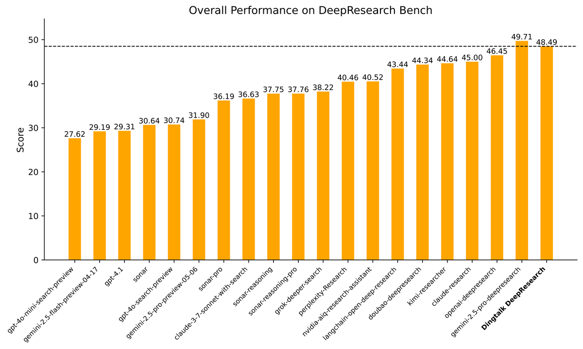 近日,由钉钉团队研发的深度研究系统“Dingtalk-DeepResearch”在国际权威评测中取得突破性成绩,在DeepResearch Bench测试中以48.49分位列全球第二、国内第一,超越OpenAI、Claude等主流系统。