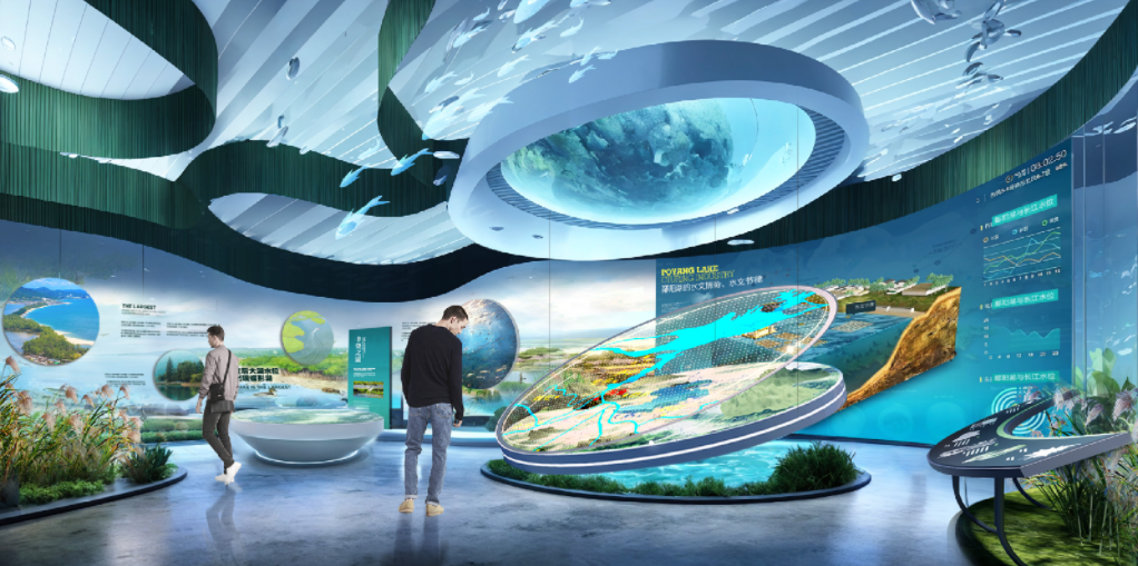 九江鄱阳湖水生生物展览馆通过光电沙盘结合透明屏演绎鄱阳湖与周边水系之间的交换关系,呈现鄱阳湖多变的成因。大型LED屏辅助光电沙盘动态呈现鄱阳湖的水文情势、水文节律以及特殊水文现象。