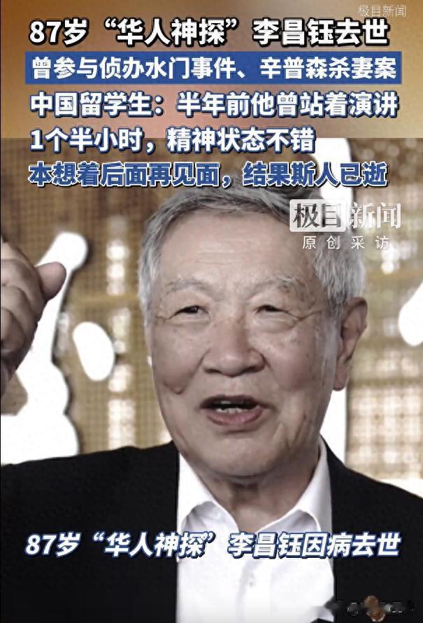 2026年3月27日,那个被全世界称为“当代福尔摩斯”“现场重建之王”的美籍华裔刑事鉴识专家李昌钰,在内华达州的家中与世长辞,享年87岁。