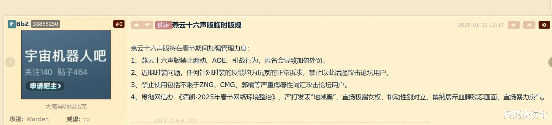 事情并没有就此结束。面对小红书玩家的“入侵”,NGA燕云版主FBBZ迅速出手,对来访的买号燕云玩家进行了批量封禁,并回复大意“已经处理,传送门点赞抱团别来沾边”。