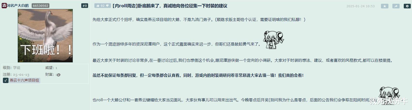 事情的开始并不复杂。在NGA燕云十六声板块的一个骂燕云的帖子“有人看直播了吗?”中,ID为“清河名产大白鹅”自曝官方身份,自称“卧底鹅”随后发布了一则征集时装建议的帖子。