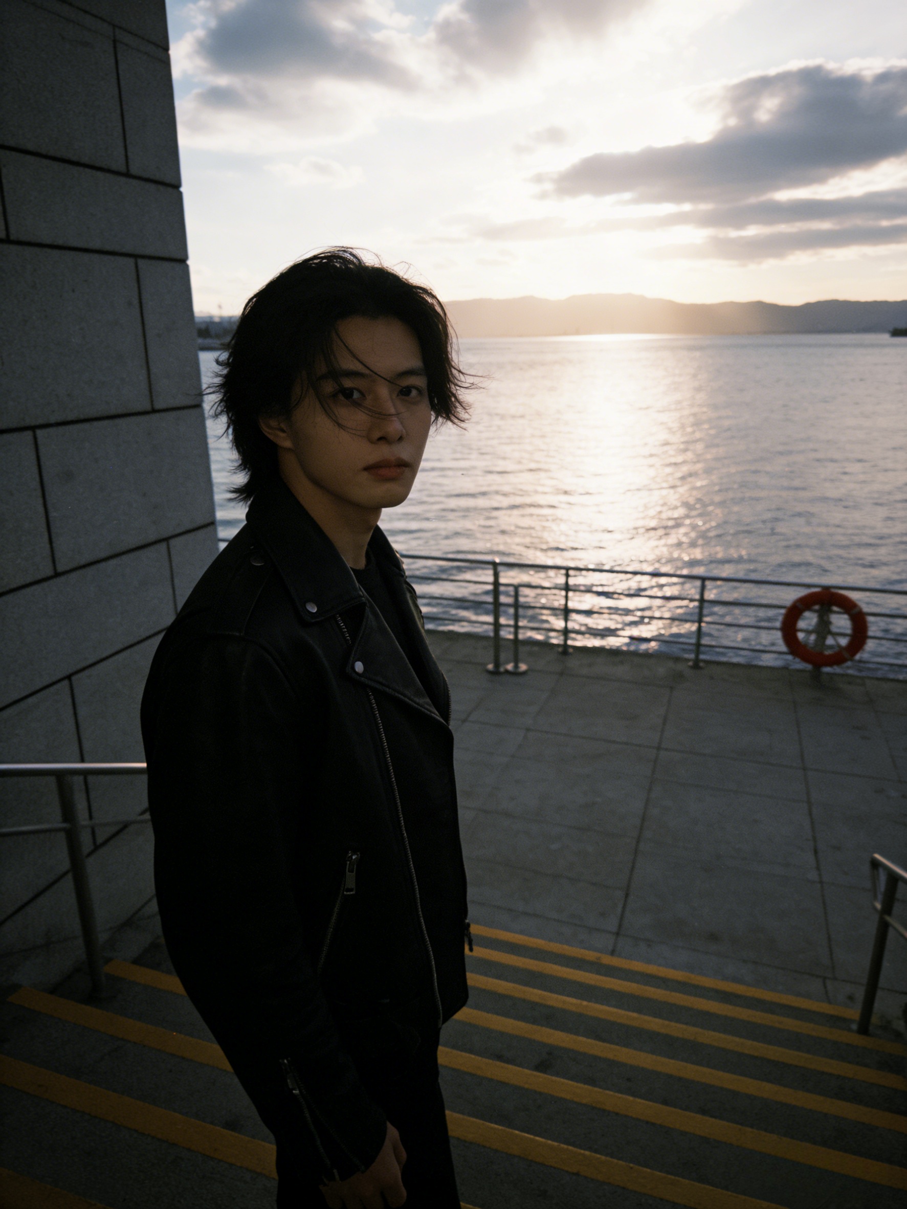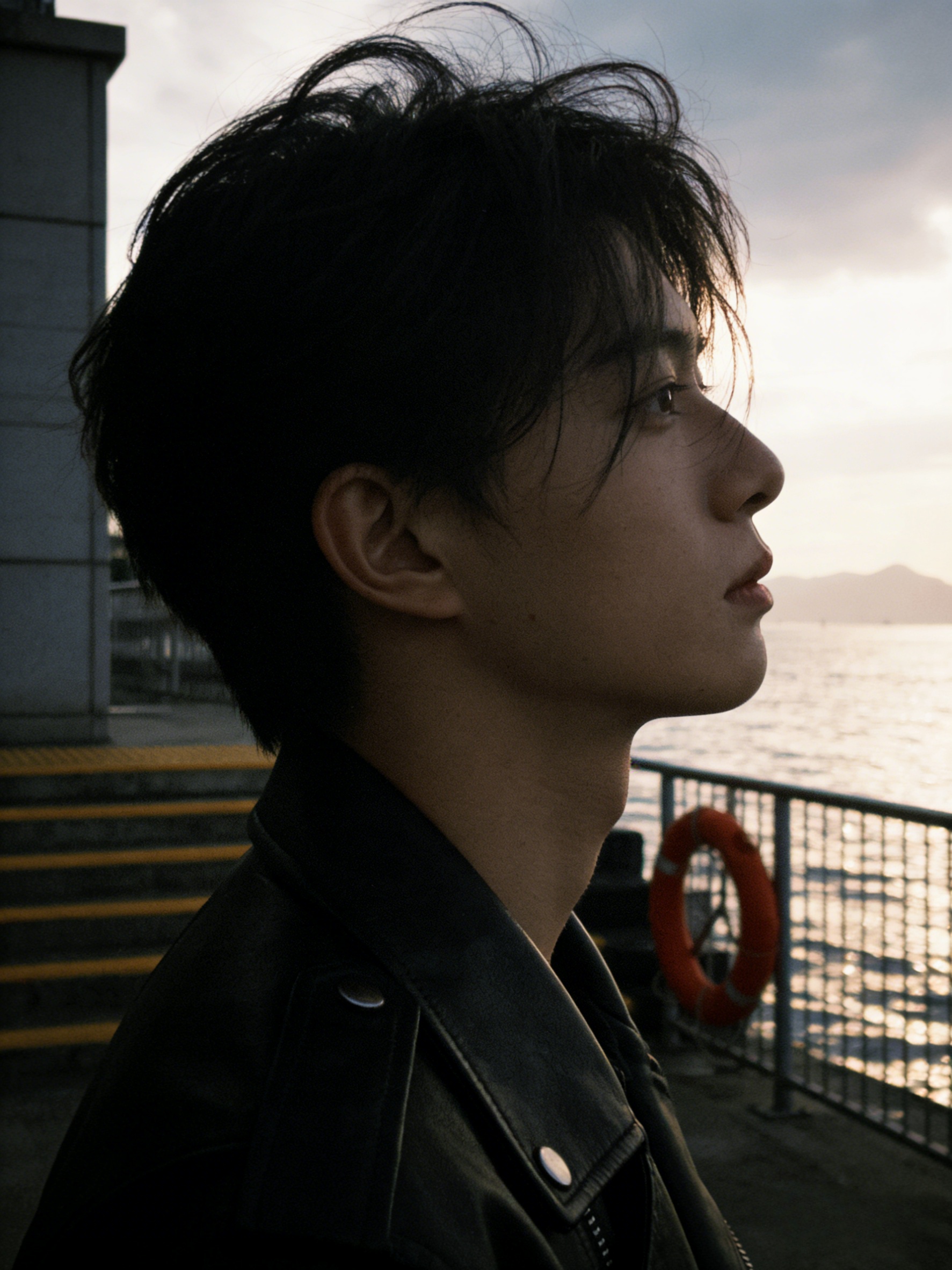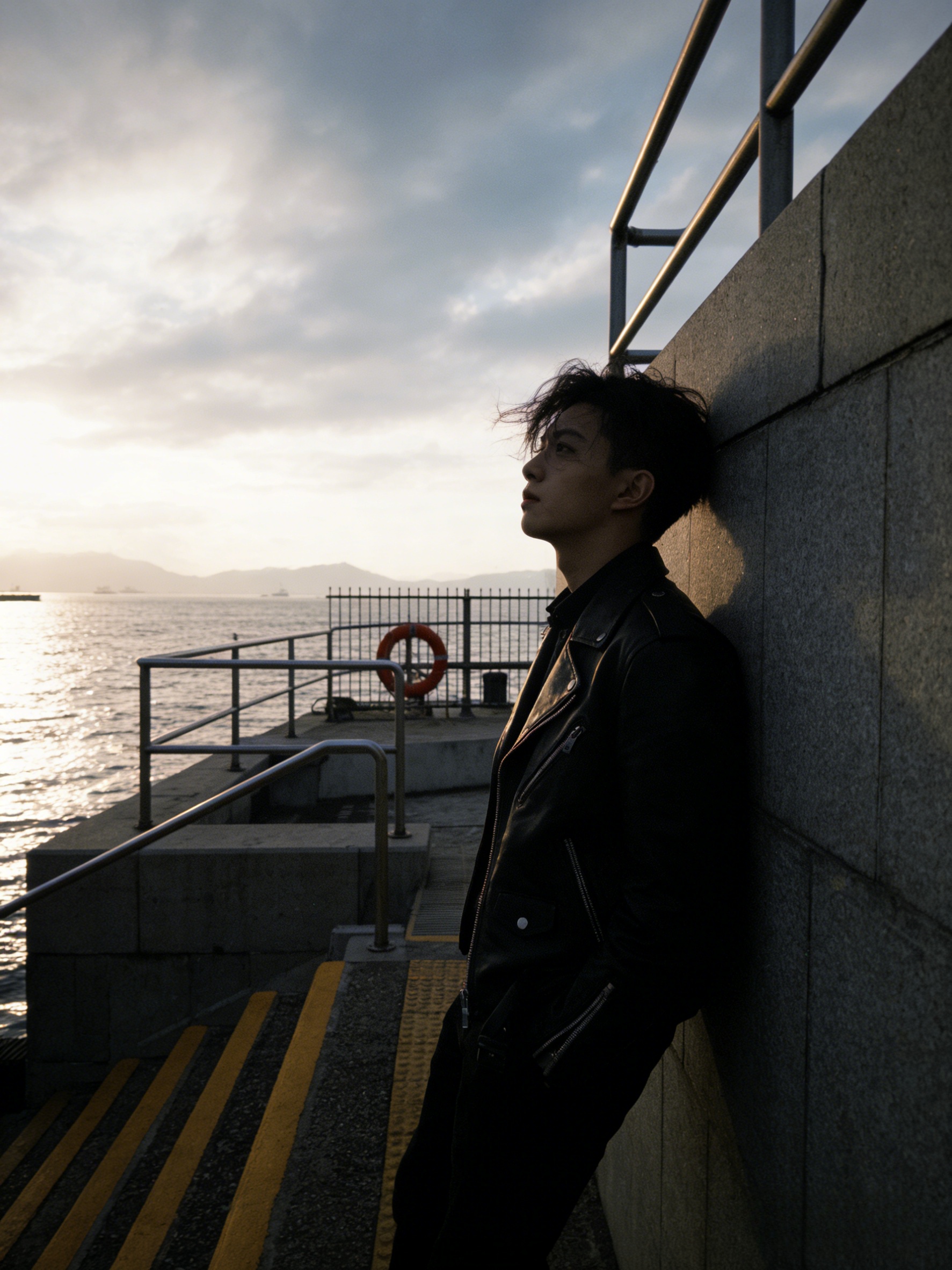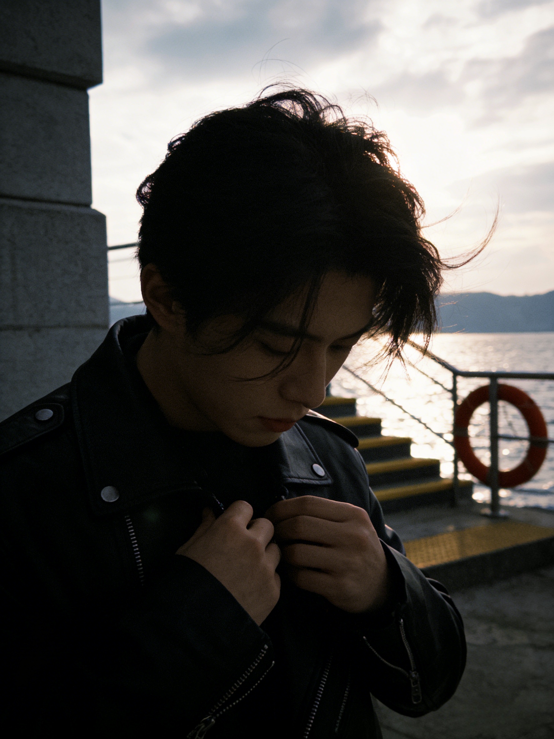 分分钟成为氛围感帅哥。指令:帮我生成图片:帮我生成九张图片:保持人物长相,多角度,变换不同动作,iPhone5s拍摄风格,画面中心参考图一,头发被风吹起,侧颜朝向左侧,或者意味深长看向远处,或者看向镜头,变换不同动作,穿着外套,神态清冷,是视频的视觉核心,深棕/黑色头发,自然蓬松略凌乱,几缕发丝掠过眼睛与脸颊。穿搭帅气,机车风。背景环境为临水的户外区域,可见灰色石质建筑,带黄色条纹的台阶,金属栏杆,红色救生圈;远处是水面,山脉,天空多云,阳光照在水面上,反射出波光粼粼,自然光线营造出清冷的户外氛围,整个画面的色调压暗,且加入黄昏暖光的色调,**f8@画面比例3:4#ai关键词 #AI画图 #ai人物#驯服AI #ai图文生成万能口令 #图文提示词分享