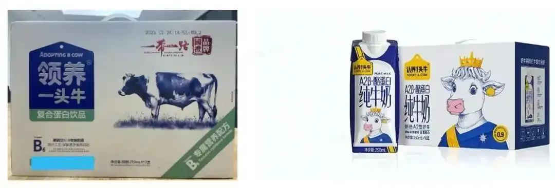 然而,就在品牌知名度不断提升的时候,市场上出现了与“认养一头牛”极为相似的“领养一头牛”复合蛋白饮品,在包装、配色等各方面都很相似,不少消费者将其当成“认养一头牛”误买。