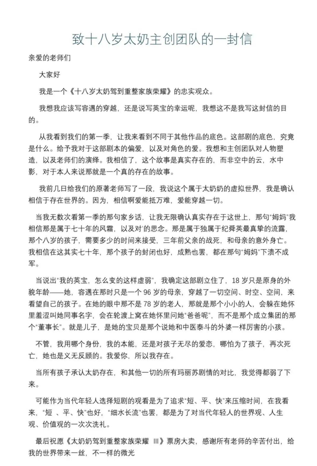 有观众给主创团队写了一封信,信中写「这个属于太奶奶的虚拟世界,我是相信存在于世界的。因为,相信爱能抵万难,爱能穿越一切」;原著作者乌英夏说「有点像在我搭建的故事里开了一扇新窗……最让我感慨的是叛逆英宝那段青春期剧情」。