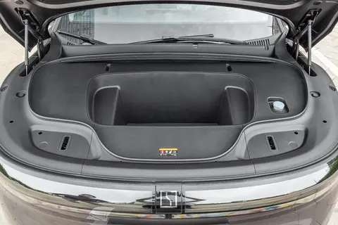 通过车头的封闭式设计形象,已经能够看出极氪7X的电驱动力身份,而且中低配车型的动力布局还采用了后置后驱的设计方式,使得前置机舱更为空旷,所以才有空间设计出前部行李舱,其容积达到了62L,平时可以用来放置一些小物品。不过底层的扰流口依旧得到了保留,舱内空调泵、电池温度管理系统等设备仍有一定通风散热需求,而且在主动闭合进气格栅的标配支持下,可将常态行车中闭合开口,仅高速行车时用于降低风阻干扰,以达到提升性能的目的。
