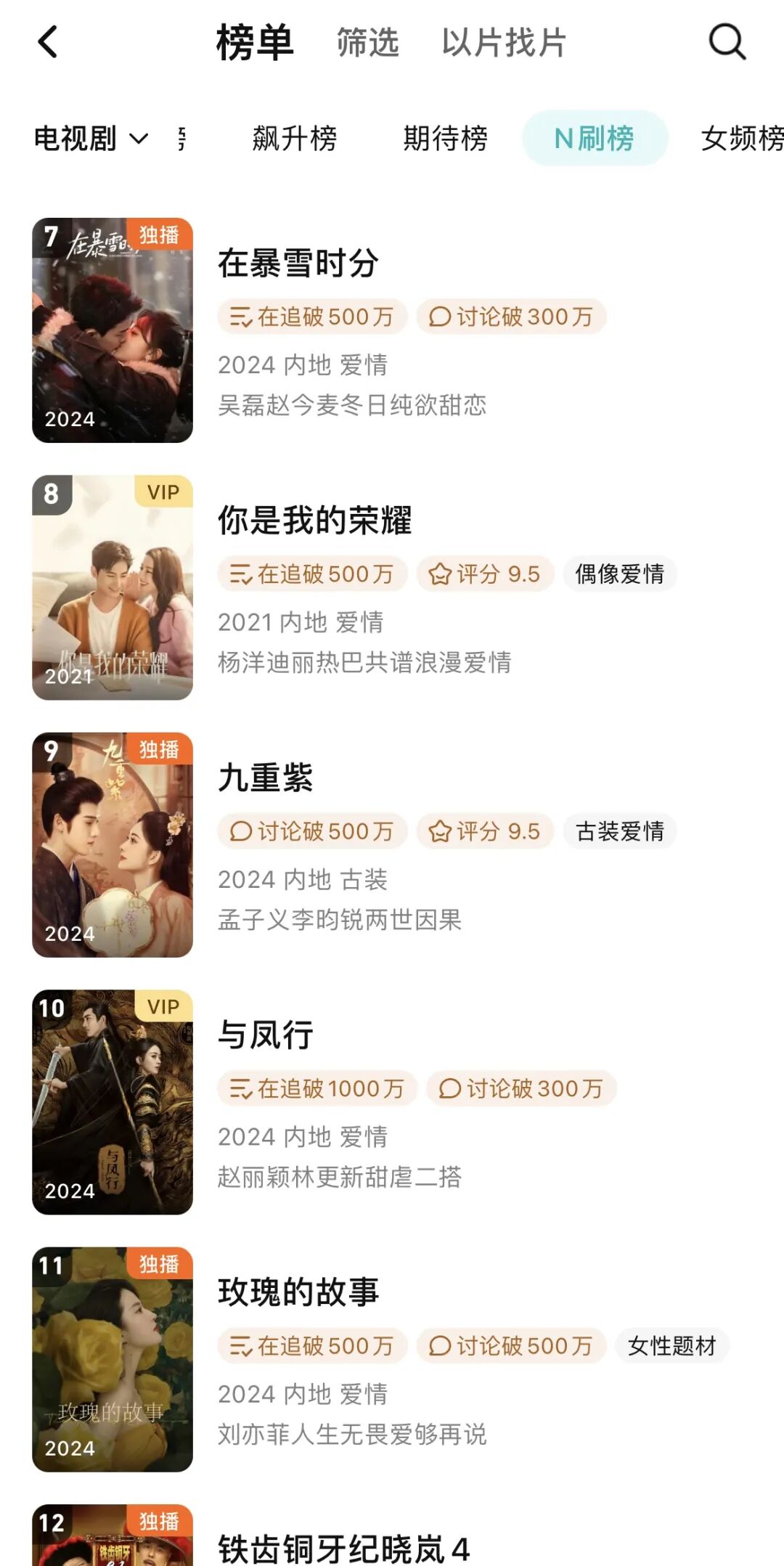 这样多维度的精品创制,也使得嘉行剧集真正具有着长尾效应。据猫眼统计,目前《在暴雪时分》和《柳舟记》的累计有效播放分别超过13亿和11亿;在腾讯视频的剧集N刷榜上,《在暴雪时分》也占据着第七位。在目前比较低谷的长剧市场中,确实就是需要更多这样耐看的好内容,请回观众、吸引观众与留住观众。