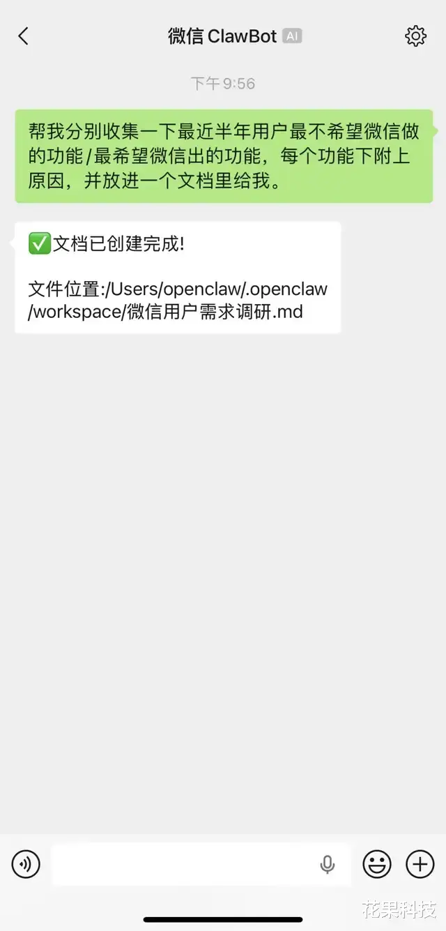 连接完成,就可以直接通过微信聊天的方式,直接在对话界面快速调用自己的“龙虾”执行需要的任务。