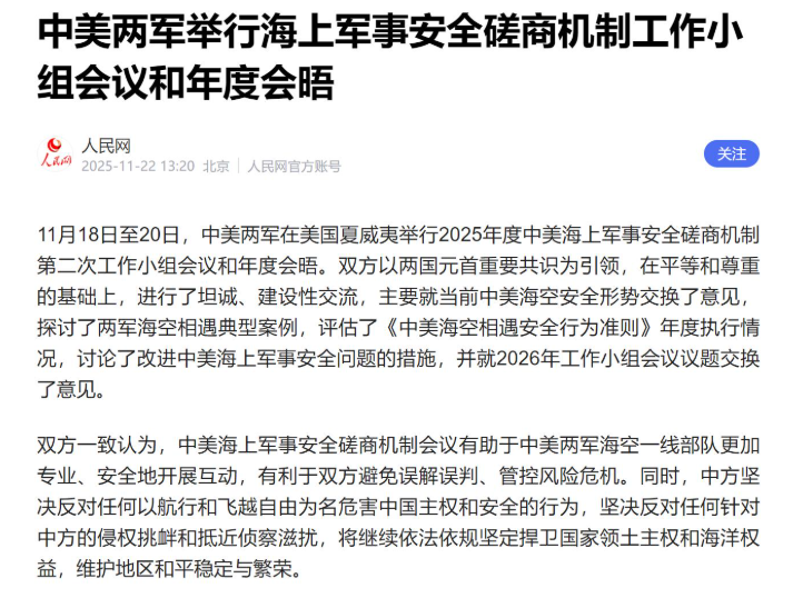 在高市积极拉拢西方国家的同时,22号我方发布消息,提到中国和美国第二次军事安全工作小组年度会晤结束。这次会晤确立了中美两军海空互动的“交通规则”,双方共同评估《中美两军海空相遇安全行为准则》执行情况,明确了避免误判、管控风险的合作路径。此举也说明台海局势的和平稳定是中美两国的共同底线诉求,任何第三方企图借台海问题挑动大国对抗的图谋都将失去生存空间。