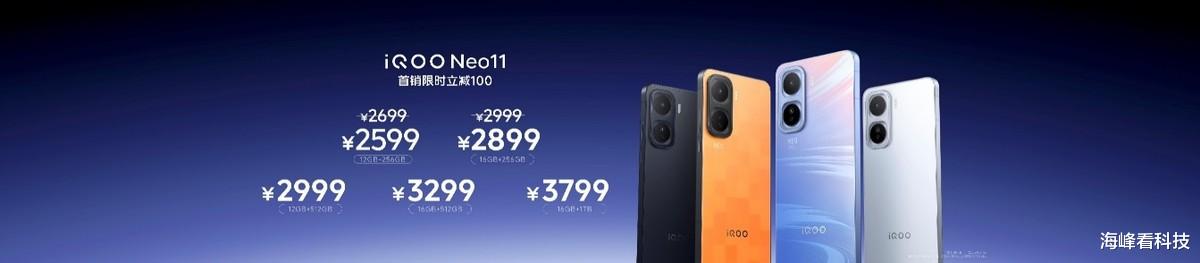 iQOO Neo11 共有 5 个版本可供选择,12GB+256GB 版本售价 2699 元(首销限时到手 2599 元);16GB+256GB 版本售价 2999 元(首销限时到手 2899 元);12GB+512GB 版本售价 2999 元;16GB+512GB 版本售价 3299 元;16GB+1TB 版本售价 3799 元,即刻下单,享更多权益。