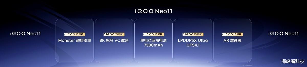 iQOO Neo11 搭载由骁龙 8 至尊版与自研电竞芯片 Q2 组成的“旗舰电竞双芯”,并在 Monster 超核引擎支撑下,带来优秀的 1% Low 帧表现、全新升级的 PC 级 2K 纹理超分、原生级 144FPS 无损超帧以及超分超帧并发,实现行业领先的游戏视效;更以 8K 冰穹 VC 液冷散热、7500mAh 超薄蓝海电池、AR 增透膜等多项 iQOO 15 同款配置、高质感金属玻璃机身和 IP68 & IP69 防尘防水等,共筑一款更优秀的强悍标准版。