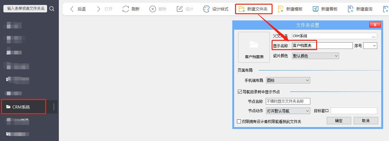 ①首先,点击【新建文件夹】,填写【显示名称】,这里我们就命名为“CRM系统”,点击【确定】。