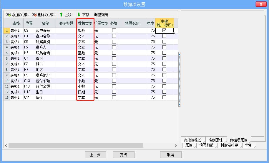 ⑦根据实际不同字段所对应的数据类型(整数、文本、小数等)进行选择设置,最后点击完成。