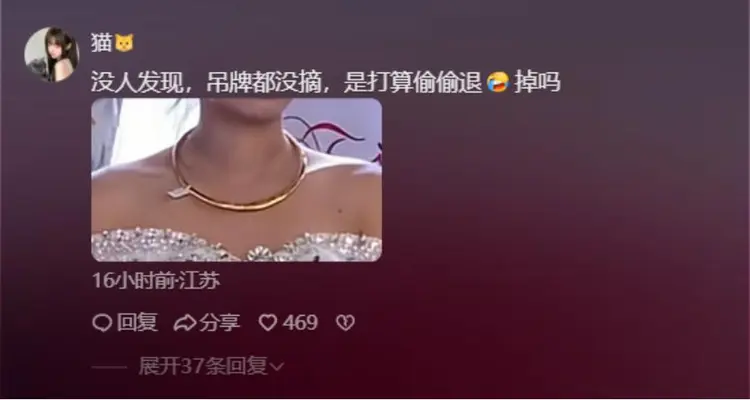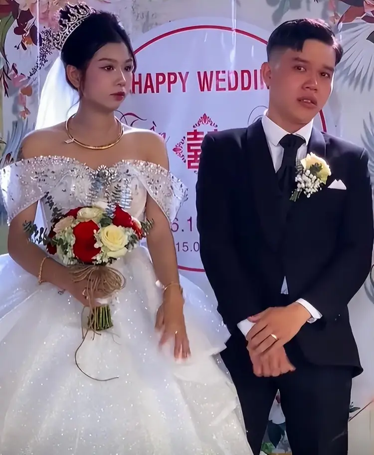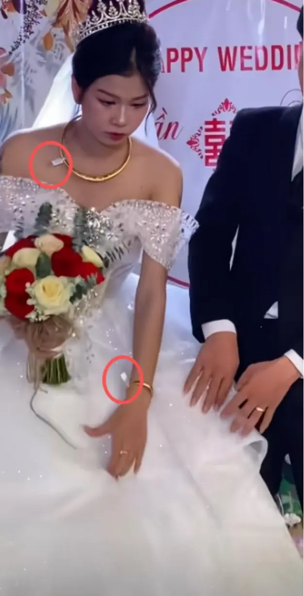 新娘脖子上戴着又粗又重的金项链,更令人意外的是金项圈上边的价签还在, 这不是此地无银三百两吗?