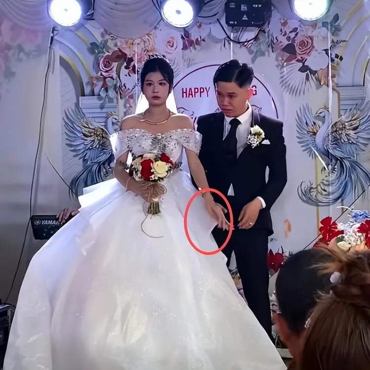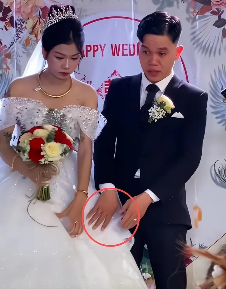 这一幕让台下的亲朋好友不停地嘀咕:“这新郎婚结的心不甘,情不愿?”接下来更离谱的一幕出现了,新郎抹了一把鼻涕,手里黏糊糊正在不知往哪擦时,下一秒就拽过新娘的婚纱下摆,把手中的鼻涕抹了上去。