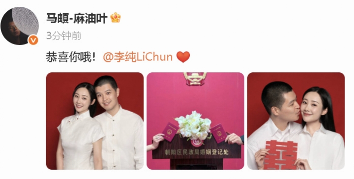 喜报!10月2日,李纯×马頔晒出红底证件照,官宣结婚! 网友第一时间冲评论区:终于修成正果,份子钱已备好,顺便给娃起好名——马思纯?笑死,这波谐音梗扣钱!