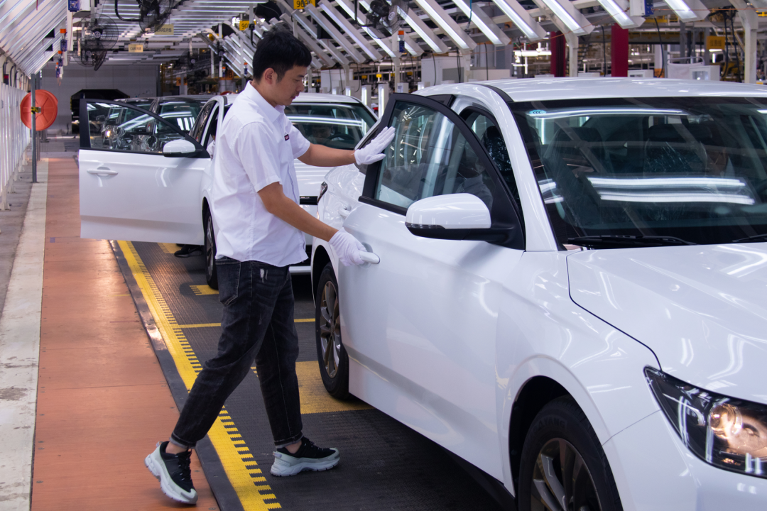 疑点4:安全考虑问题。在汽车制造厂内,工人的安全是至关重要的。然而,在这张图片中,工人站在车辆旁边进行操作,而没有采取任何额外的安全措施(如使用支撑架固定车门,或确保工作区域的安全隔离)。