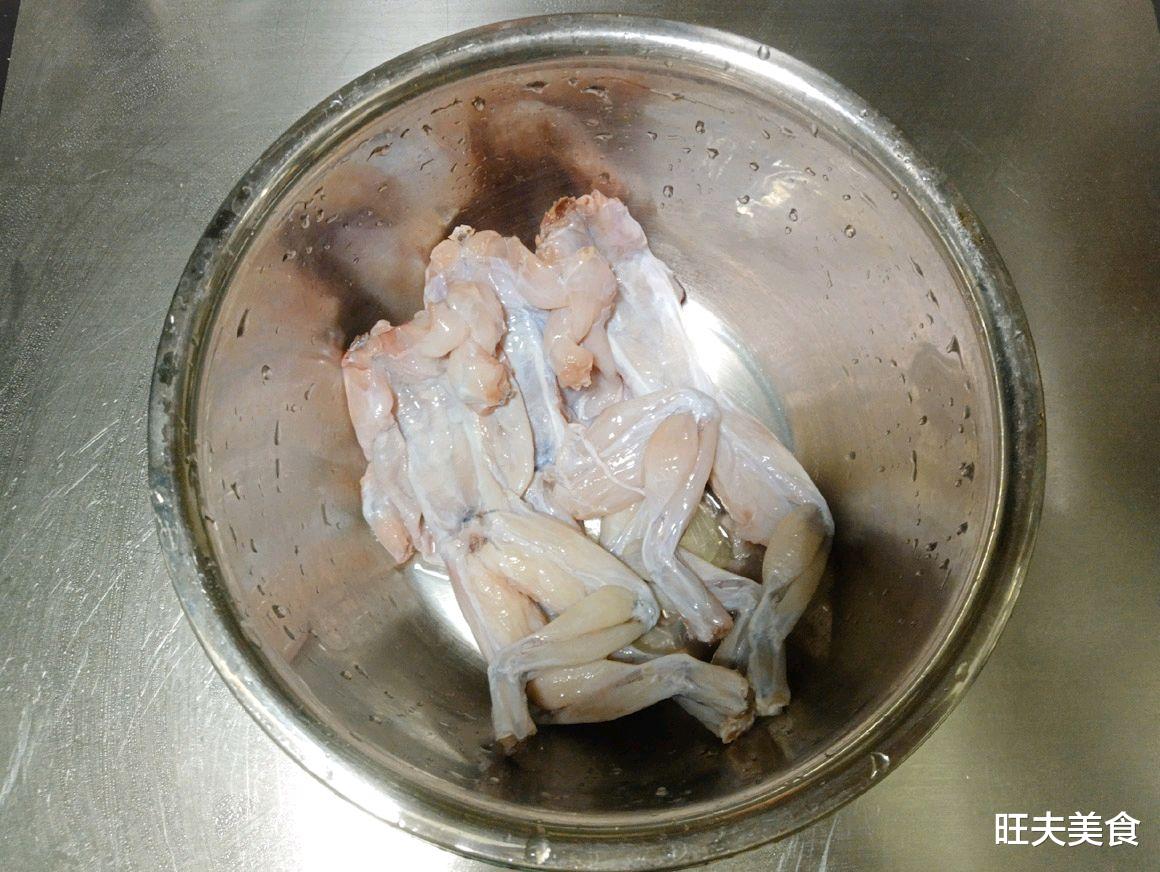 在超市淘到的已剥好的牛蛙回到家,洗净备用,别忘了把爪子去掉。因为在这场美味的表演中,精简会更好。