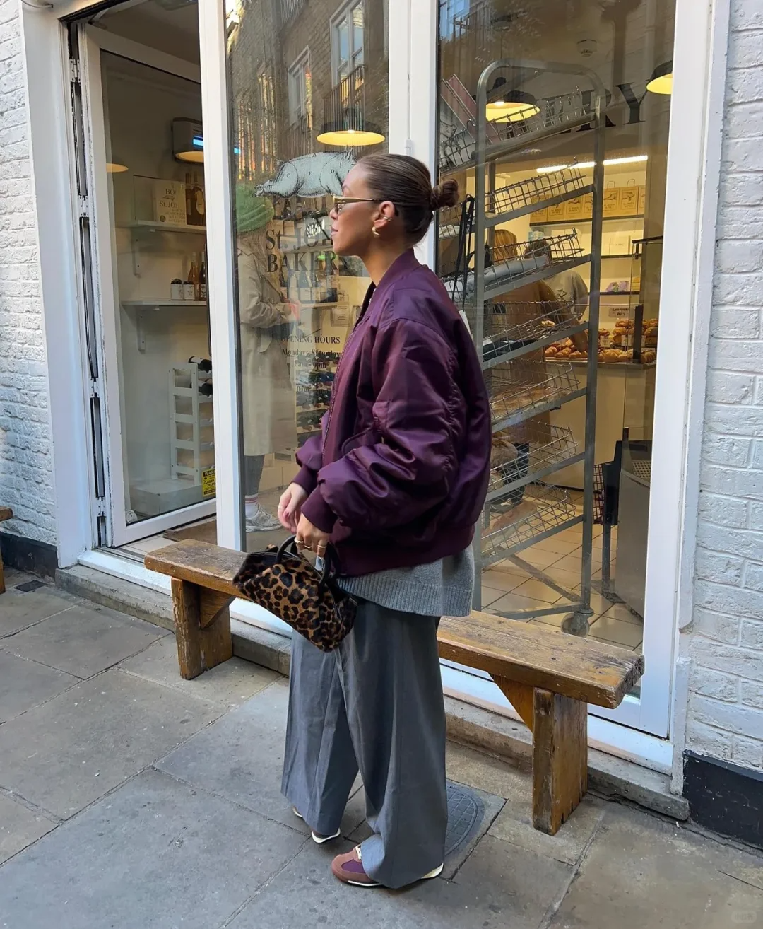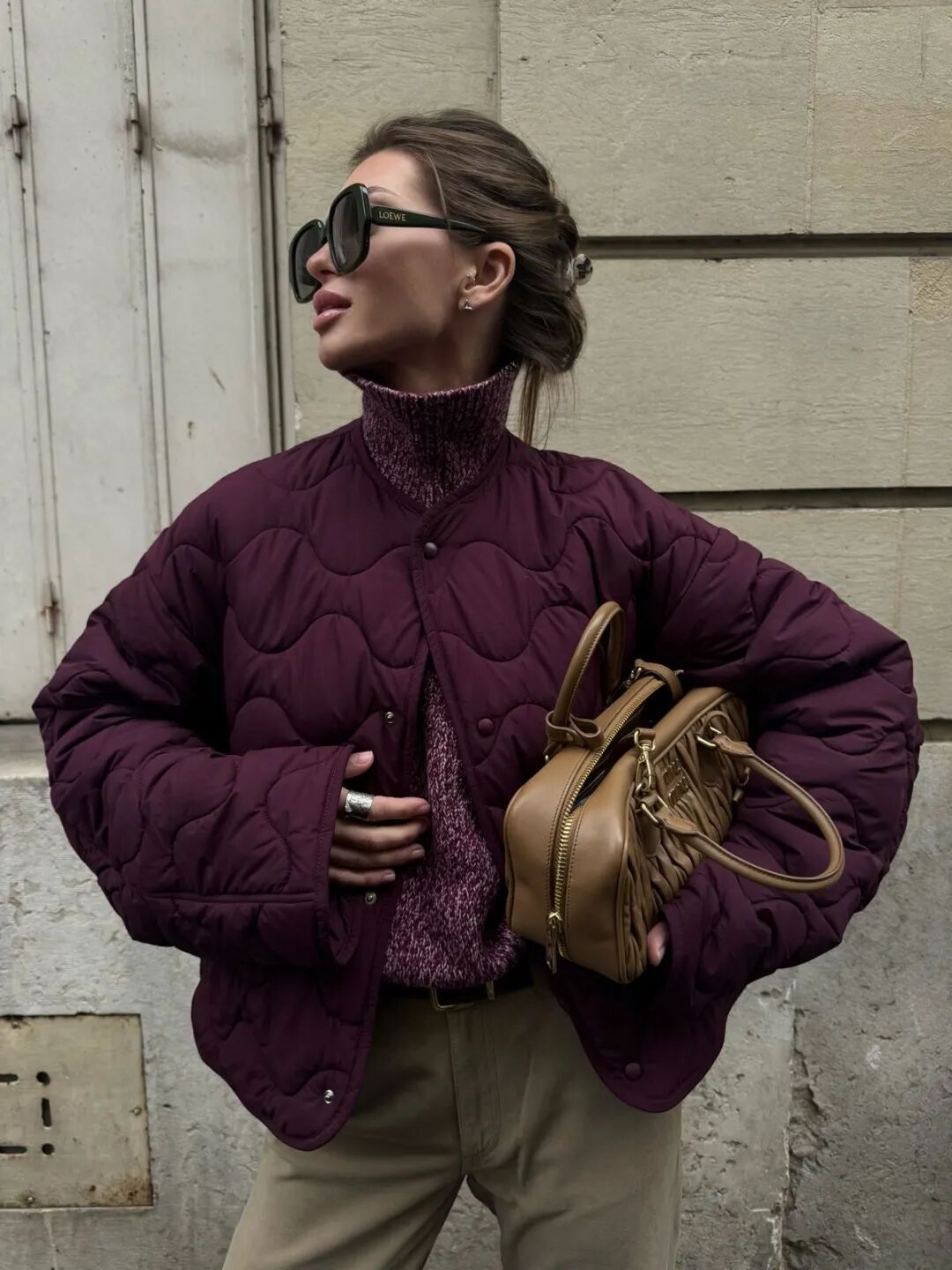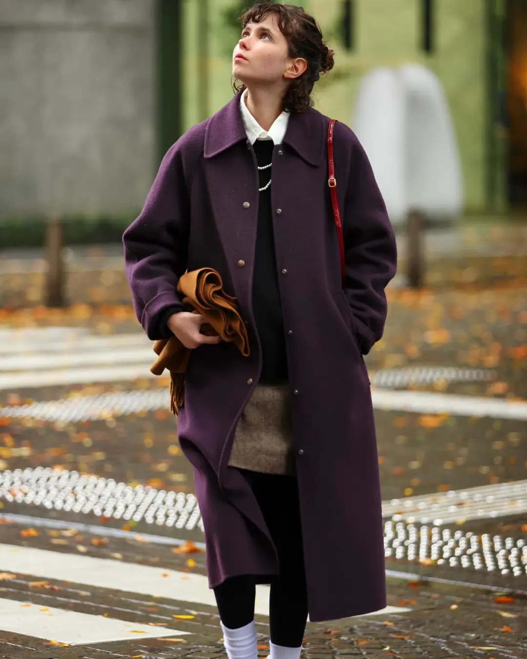 紫色夹克与大地色单品搭配,温暖而高雅,非常适合日常通勤。