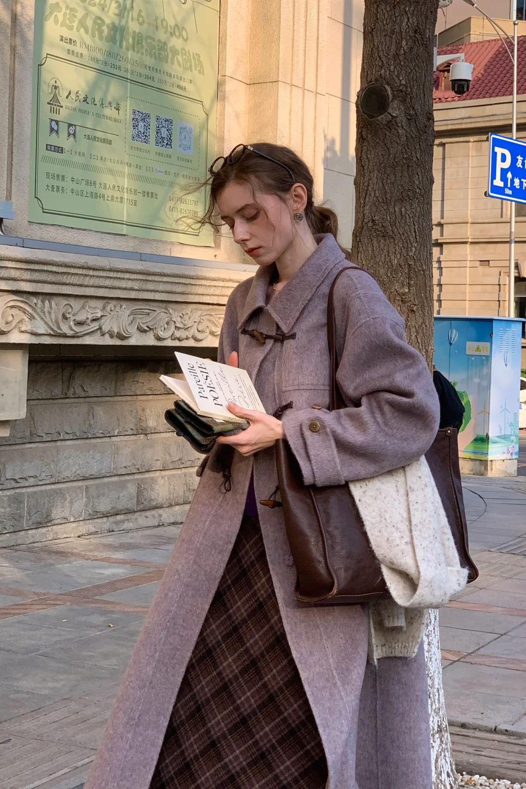 桑葚紫双面呢廓形大衣 +灰色格子半裙 + 黑色长靴,搭配棕色包包与金色耳环,气场全开。