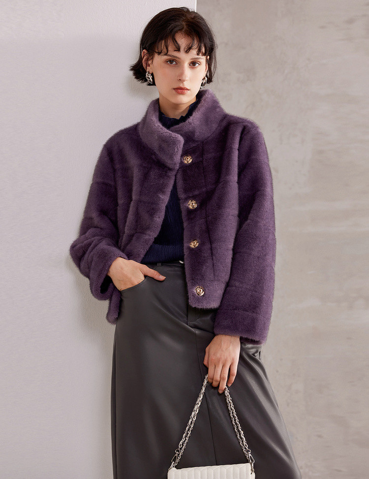 紫色皮毛一体或皮草外套自带贵气感,适合冬季低温天气,材质以仿皮草、短毛皮毛一体为主,既环保又不失质感。