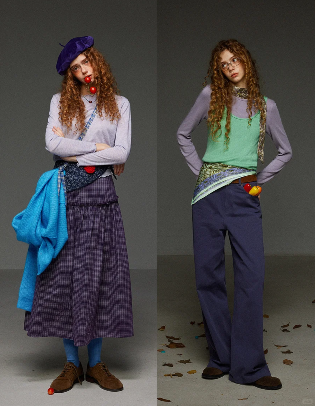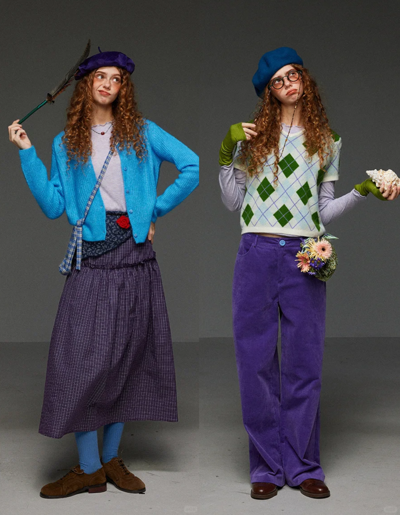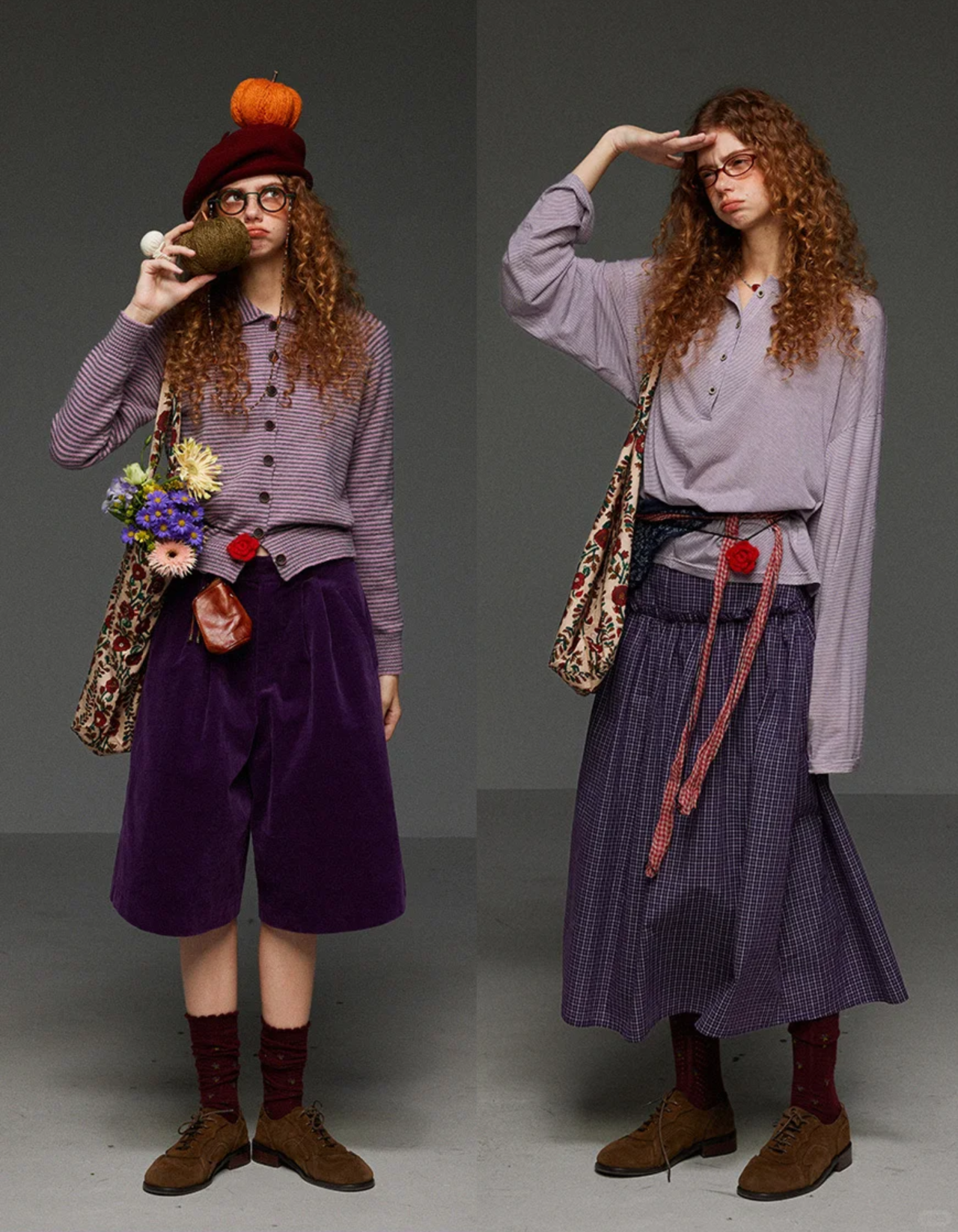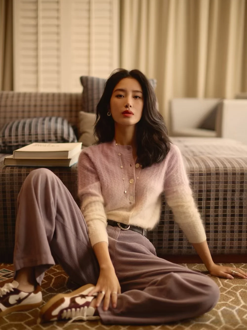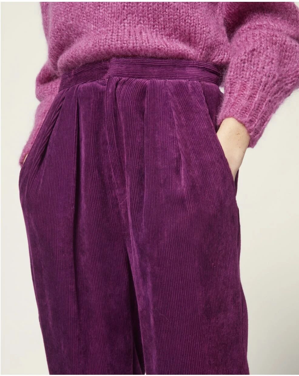 紫色灯芯绒长裤通过同色系渐变营造层次感,整体色调统一,高级感十足。