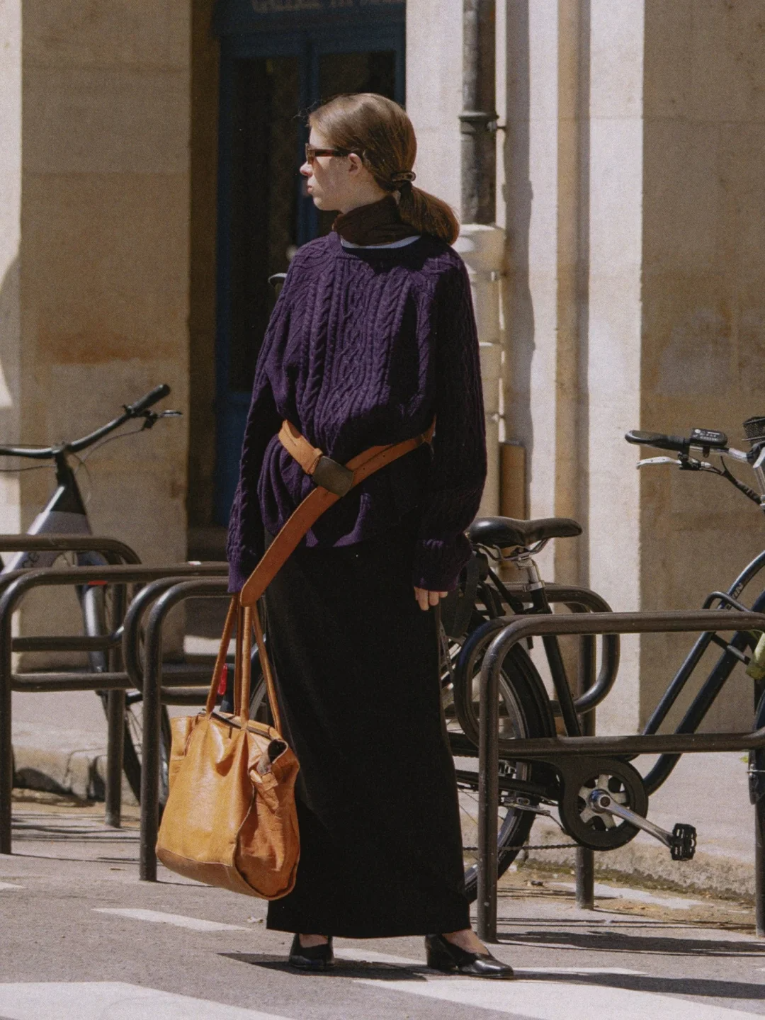 轻薄的紫色打底衫是冬季叠穿的关键,既能打破深色外套的沉闷,又能为整体造型增添亮点。