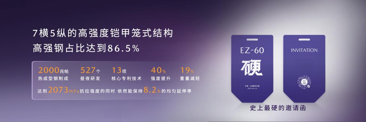 EZ-60 延续了马自达在安全领域的核心DNA。发布会上,长安马自达汽车有限公司执行副总裁邓智涛向参展嘉宾展示了“史上最硬的车展邀请函”——它以2,000MPa的热成型钢制成,取自EZ-60的车身,历经527个昼夜研发,包含13项核心专利技术,在达到 2,073MPa抗拉强度的同时,依然能保持8.2%的均匀延伸率,强度提升40%,重量减轻19%,这块特殊的邀请函象征着长安马自达在安全领域追求极致的坚定信念。