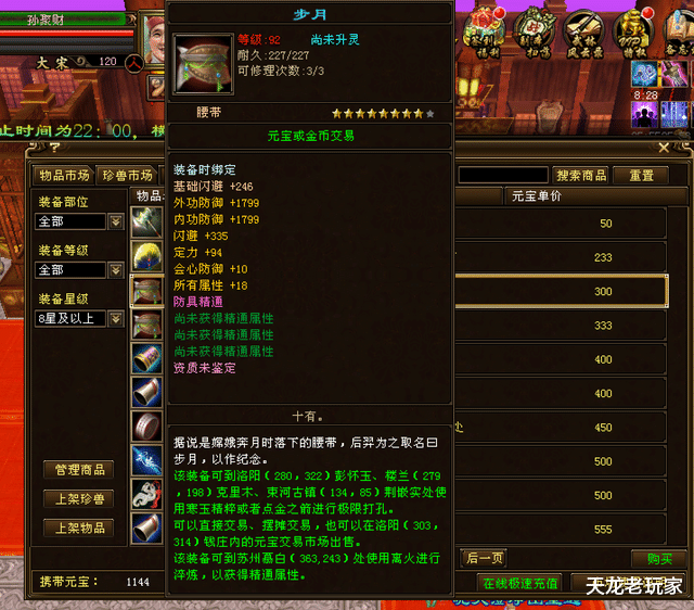 再看看钱庄寄售的八星价格,这个不带体力的大八星腰带还是挂价最便宜的,也需要300元宝。