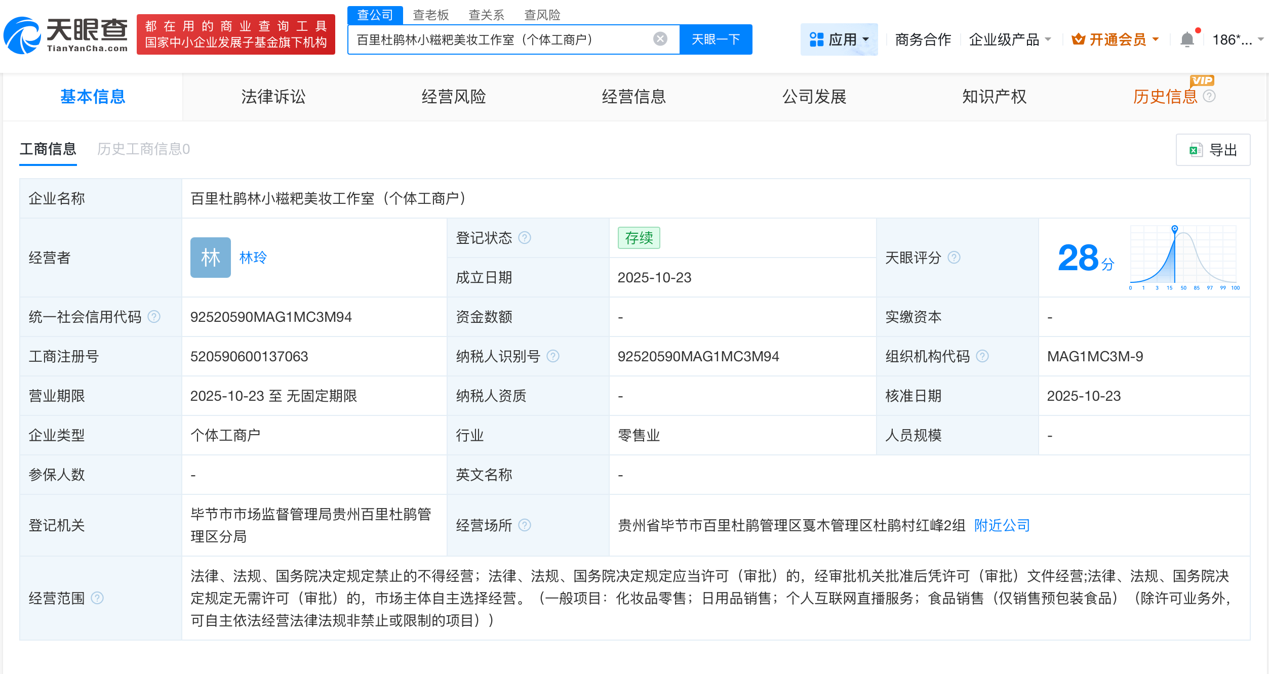 天眼查App显示,今年10月,百里杜鹃林小糍粑美妆工作室(个体工商户)成立,经营者为林玲,经营范围包括化妆品零售、日用品销售、个人互联网直播服务等。