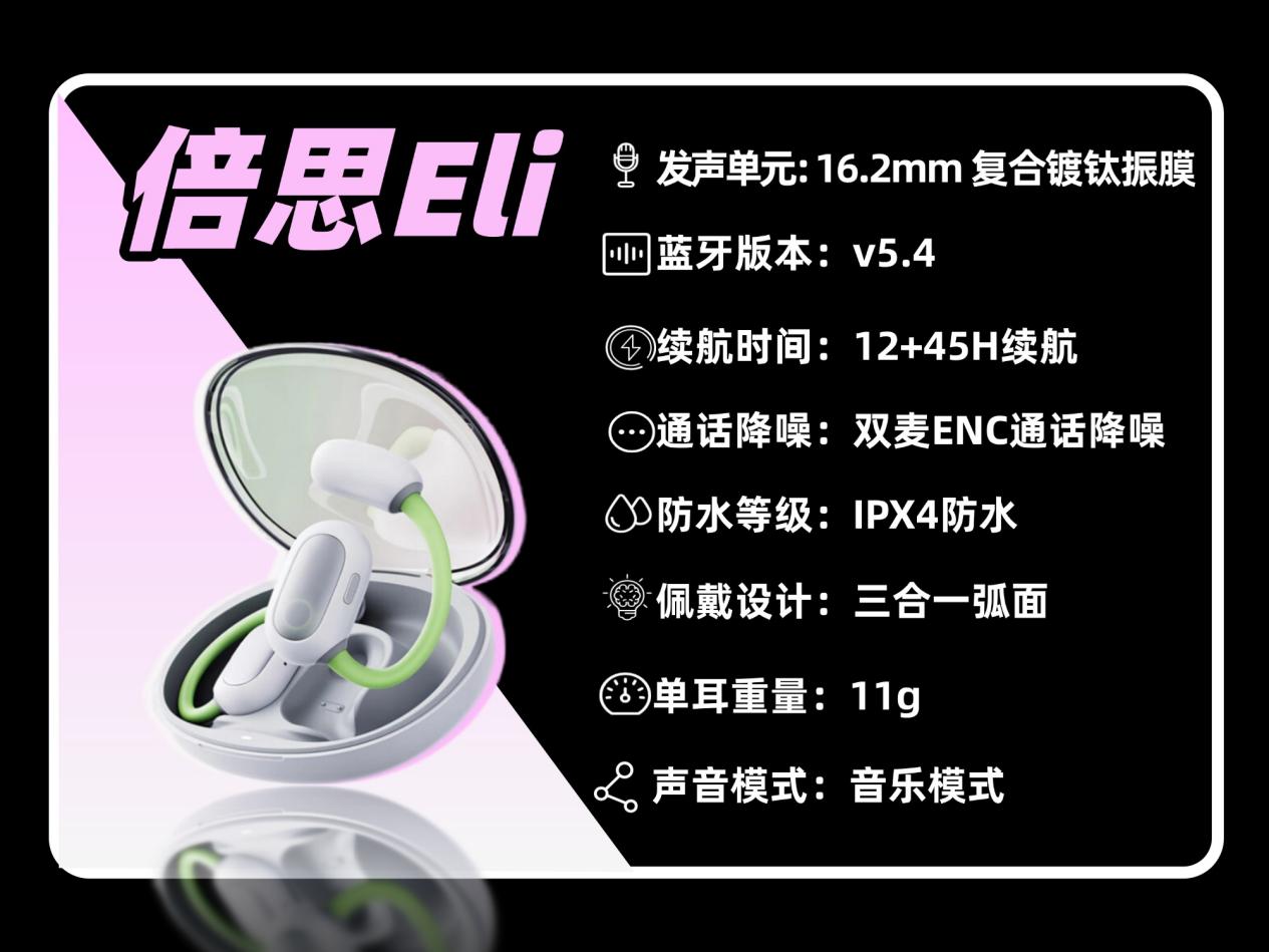 这款耳机把佩戴舒适感拉满,流线型工学设计贴合耳部轮廓,搭配亲肤液态硅胶材质与可调节耳挂,单耳仅8克的重量,戴久不闷且稳固不晃,跑步、通勤都能轻松hold住。性能上更是亮点十足,16.2mm石墨烯振膜带来媲美千元级产品的音质,专属防漏音模式还能智能拾取漏音信号、发射反相声波,有效降低98%漏音,避免打扰他人;四麦克风阵列加ENC降噪算法,让通话清晰无杂音,蓝牙5.4芯片则保证连接快速稳定,还支持智能一拖二。同时它具备IPX6级防水,汗水雨水都不怕,续航也很给力,单耳机约8小时续航,搭配充电仓可达32小时,创新的触片式充电更是解决了传统触点接触不良的问题,充电高效又省心。